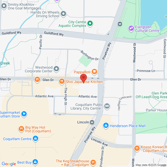 We’re at 2992 Glen Drive, just north of Coquitlam Centre Mall, between The High Street and Pinetree Way